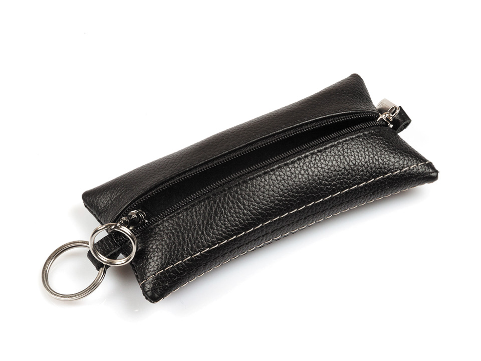Футляры для ключей на кнопке, молнии, с удобным закругленным углом. С заводным кольцом или металлическими держателями и карабинами.</li>